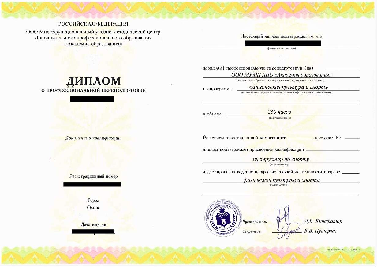• «Инструктор по спорту», «Инструктор по физической культуре» с правом работы в сфере физической культуры и спорта;